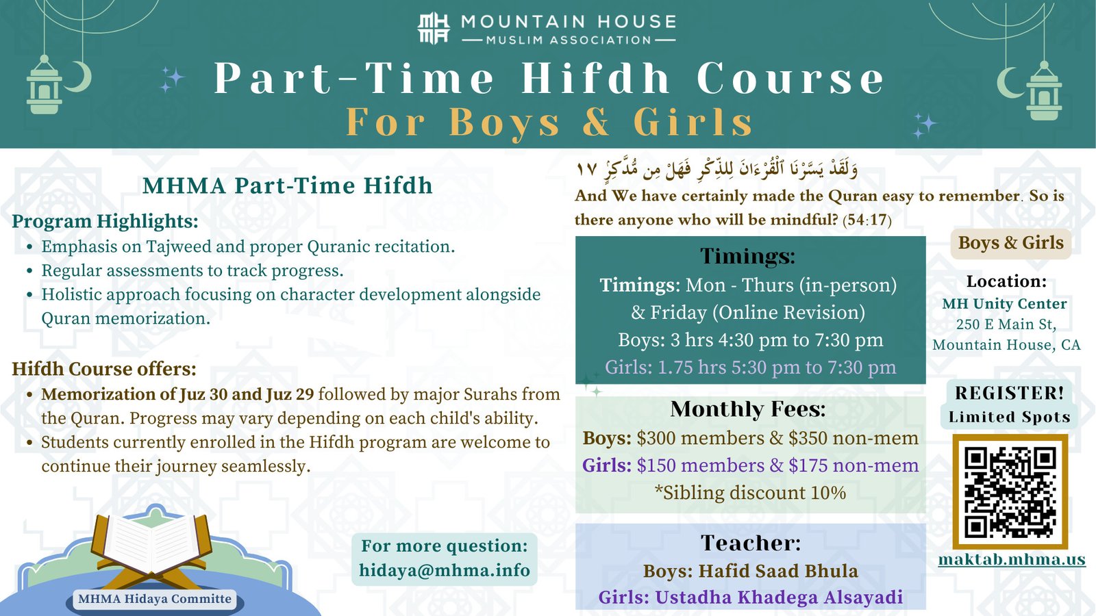 The memorization of the Quran is a long-living tradition from the time of the Prophet Muhammad (Peace be upon him). We offer a unique program that fulfills the needs of local Mountain House Muslim community.